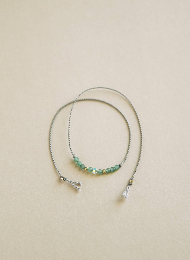 Beautiful, dainty and minimalistic string bracelet made from 100% silk grey string,2-3mm natural green aventurine crystal, and crystal bicone bead in the center.