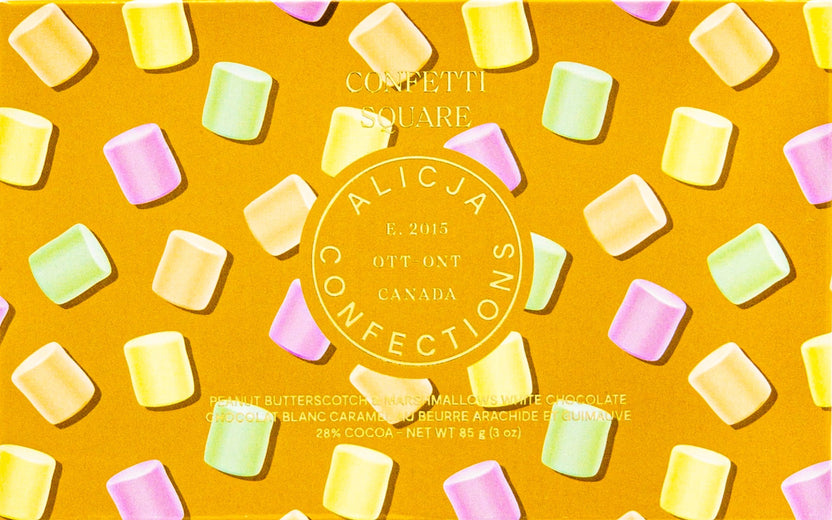 Confetti Square is a 28% white chocolate bar. Full of rainbow marshmallows, peanut butter, and butterscotch. A Manitoba potluck classic treat!