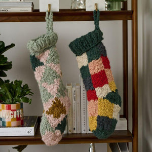 Dress up your mantle with the Cottage Stocking Collection. Handmade by artisans in Nepal, each stocking features a unique knitted pattern. Both stockings have solid green bands at the top with a yarn loop for hanging. The chunky knit offers an organic look and pairs beautifully with each other or with the Quiet Night Stockings for a coordinated festive display.
