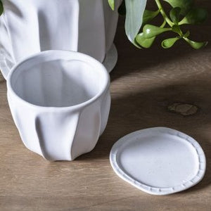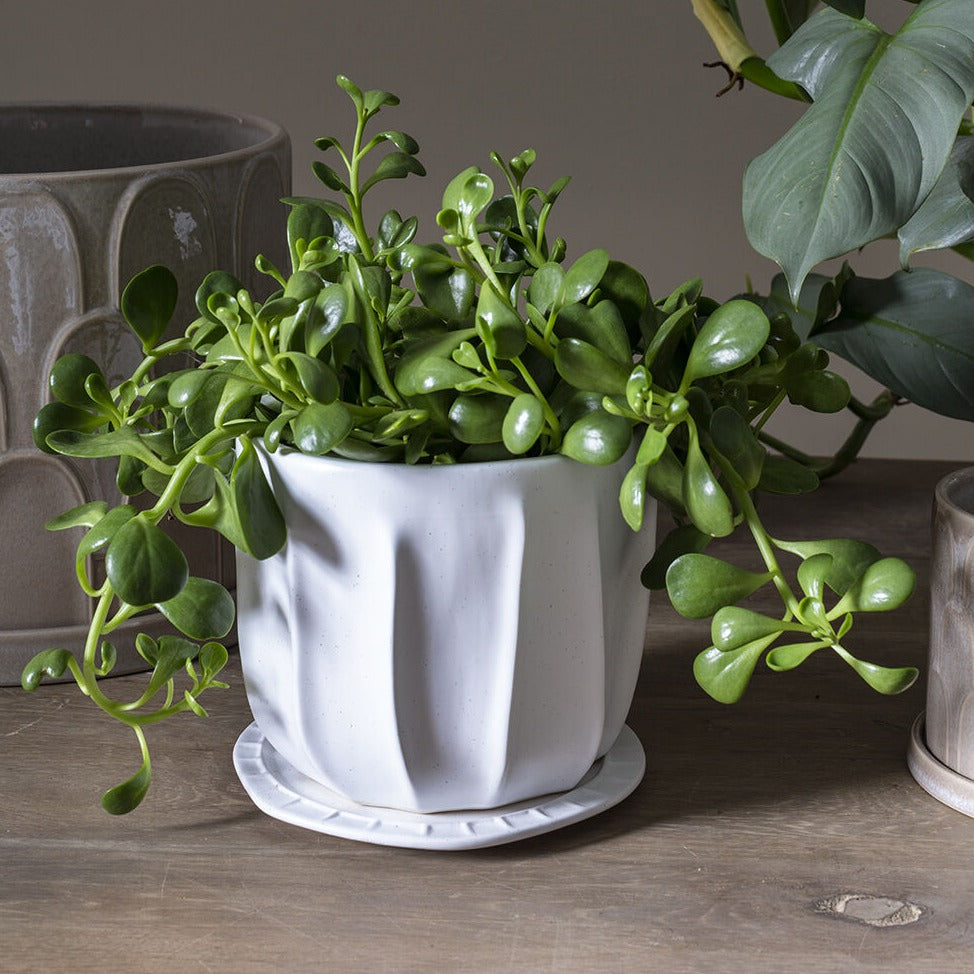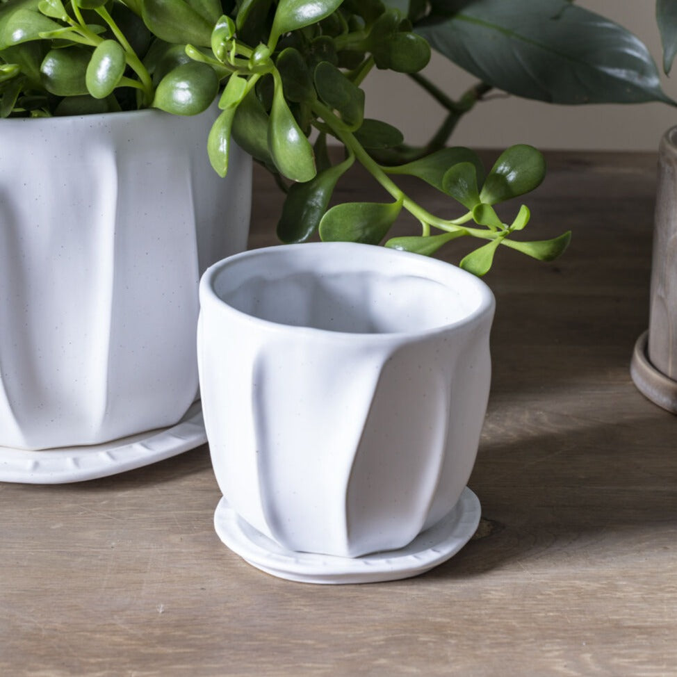 The Draken Pot features a smooth white finish with raised grooves to add organic style to a simple silhouette. A drainage hole and simple saucer make it an everyday staple for your houseplants with an extra dose of style.