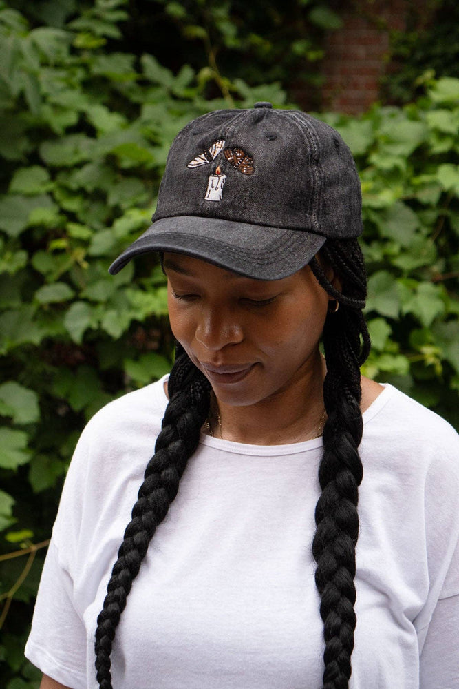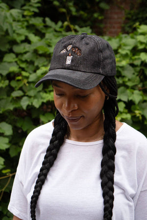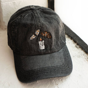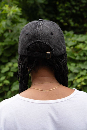 These caps have a slightly deeper fit than our typical dad hats, as well as a longer bill. Adjustable strap back with metal clasp.
