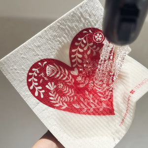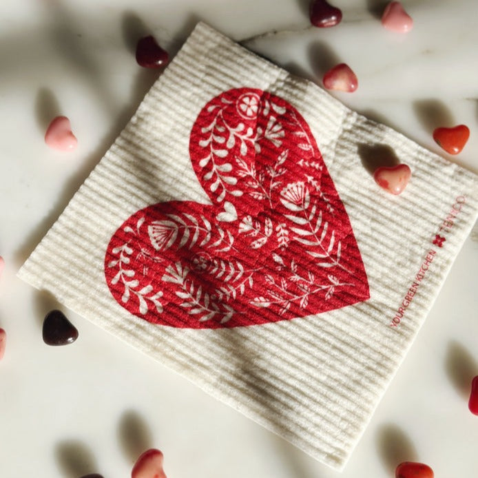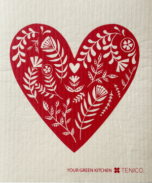 The original Ten and Co. plastic free dishcloth, the Swedish Sponge Cloth, in a beautiful Folk Heart print! Original Artwork in collaboration with Your Green Kitchen.