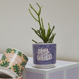 Normalize the beauty of weirdness with this happy reminder on a pot. The footed cylinder Funky Phrases Pot features a white speckled base with an artful decal of dark purple concentric squiggle shapes on a light purple background & the words Stay Weird.