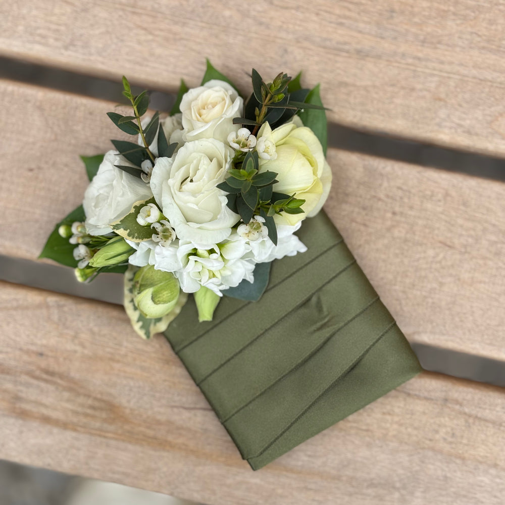 A simple and modern boutonnière with flowers and colours to compliment the wedding palette.