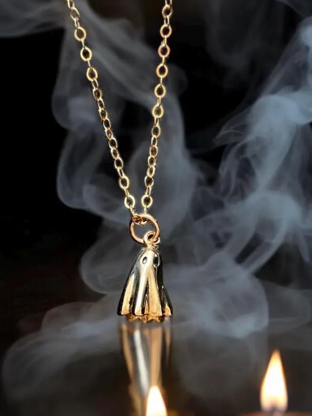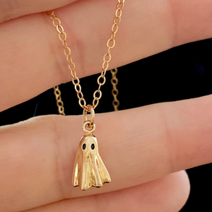 The Spooky mini steel Ghost pendant necklace. 14K gold on Constructed from hypoallergenic stainless steel, this mini ghost pendant features a spooky yet sweet design. The paperclip chain adds durability, while the black antique eye and 3D ruffle edge create a floating vibe.
