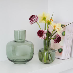 Create a vintage-inspired arrangement like no other with the Hana Vase. Featuring a wide base & slight flare on a slim neck, this green colored glass vase offers a clean silhouette. It also makes a great home for propagation clippings. We recommend hand washing or wiping clean to keep the color fresh & beautiful.