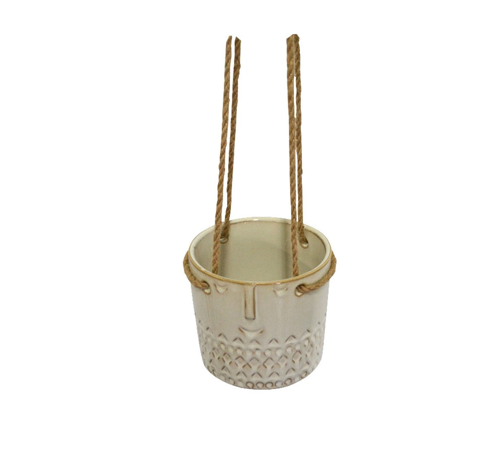 The Hidalgo Hanging Planter is a cream ceramic container decorated with a minimalist design.