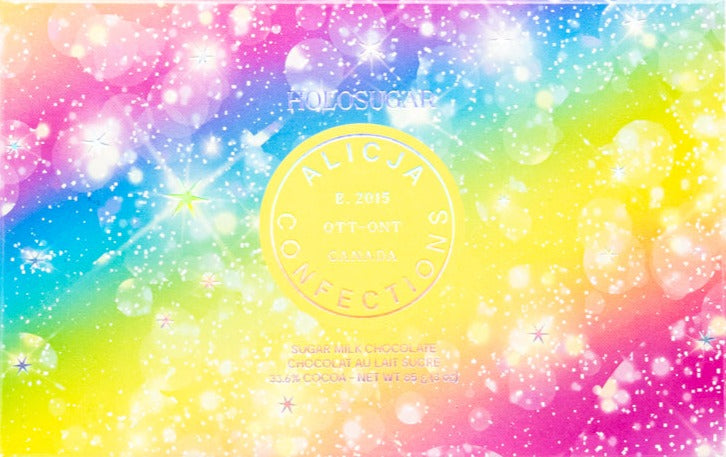 HOLOSUGAR is a 33.6% milk chocolate bar. Covered with glittery, crunchy, and sweet sanding sugar. This bars packaging is covered in holographic foil. HOLO lovers... welcome.