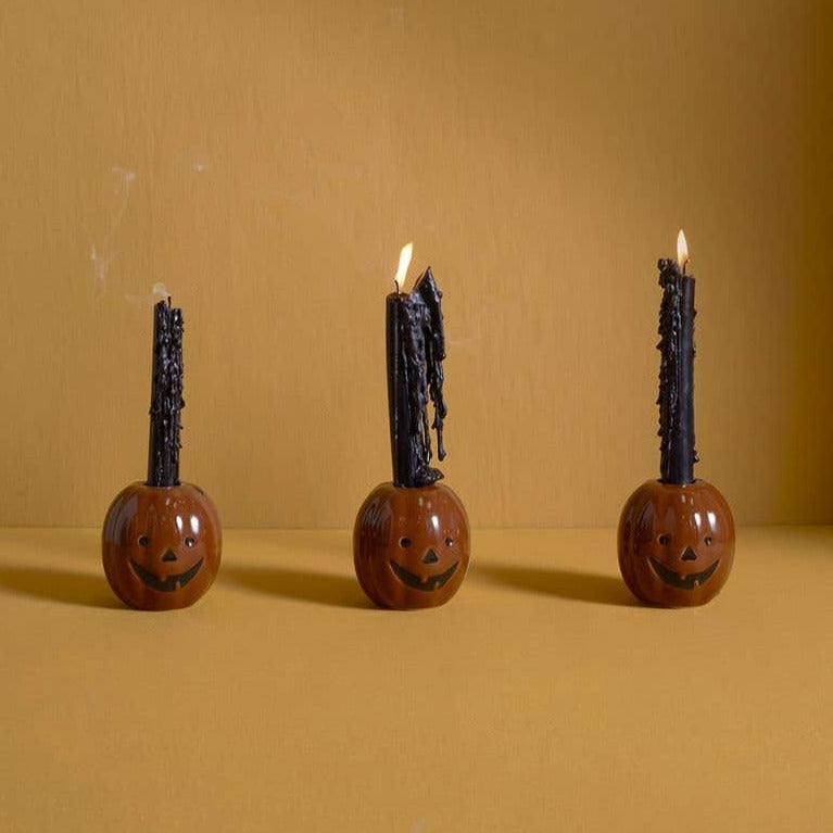 The Jack Candlestick Holder is a different take on a jack-o-lantern. Place a drippy taper candle is this ceramic pumpkin shaped holder for a festive addition to a seasonal table.