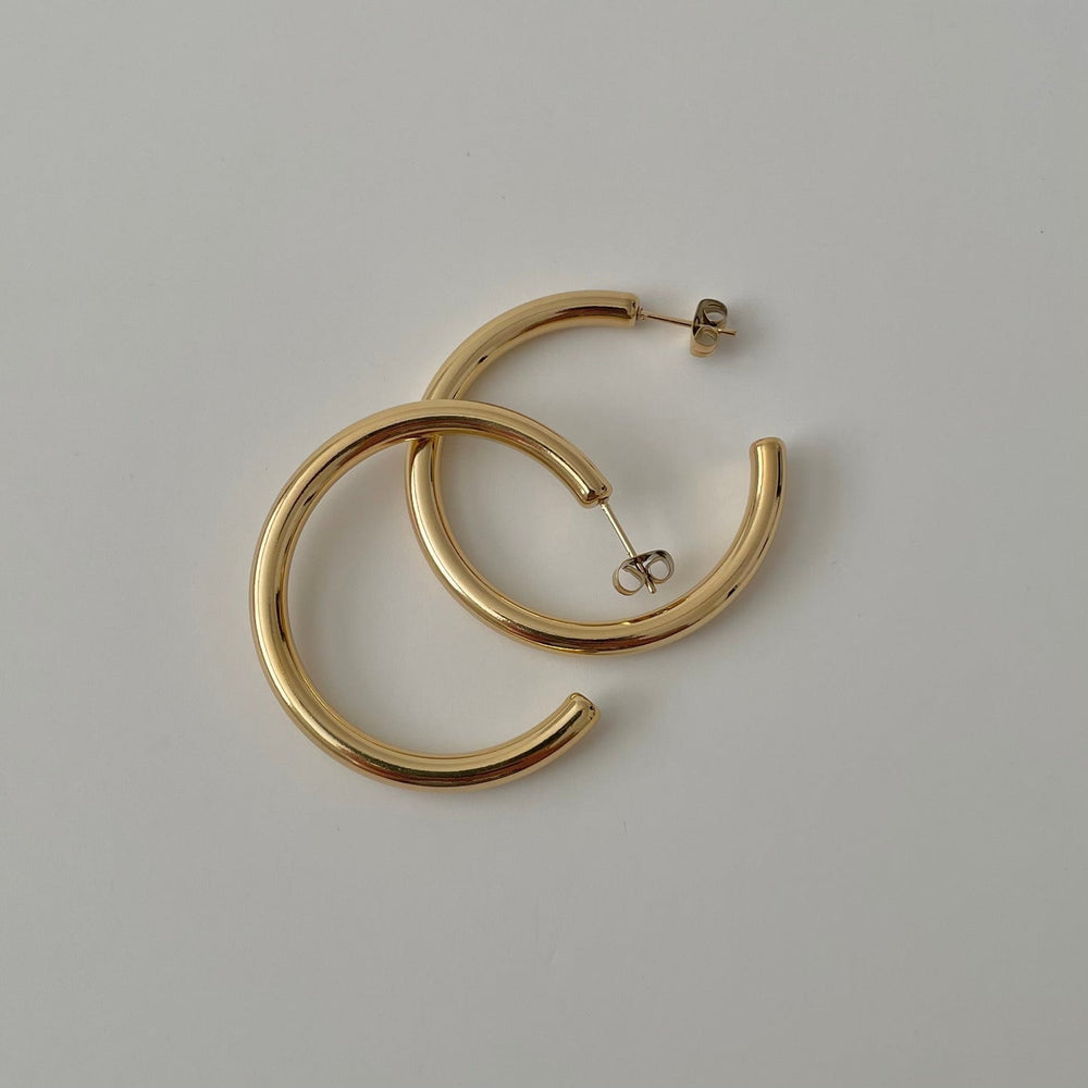 Stand out with the Jenna Hoops from Namaste Jewelry. Statement gold hoops that are unbelievably lightweight and super comfy. Plus, they're hypoallergenic, nickel + lead free, and won't tarnish. How's that for a triple threat?