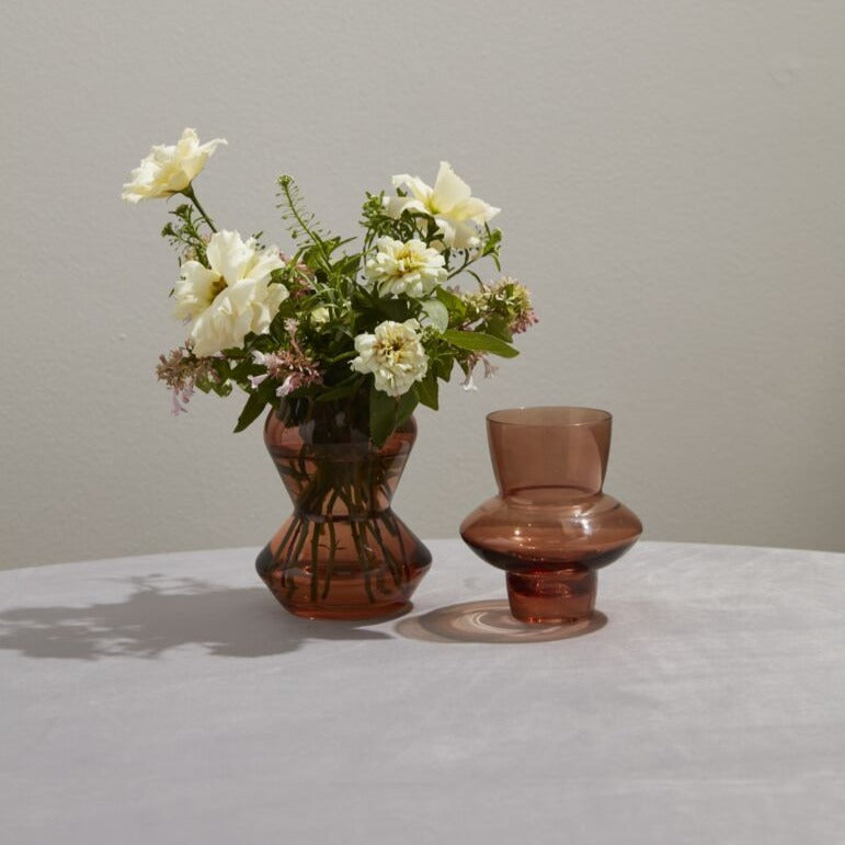With its modern, curvy silhouette & smoky brown hue, the small-scale Kigali Vase is a stunning canvas for your creativity. Showcase small fresh or dried floral arrangements for a colorful contrast that complements all home decor or wedding & event design. To clean this handmade glass vase, we recommend gently wiping to keep the color fresh & beautiful.