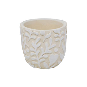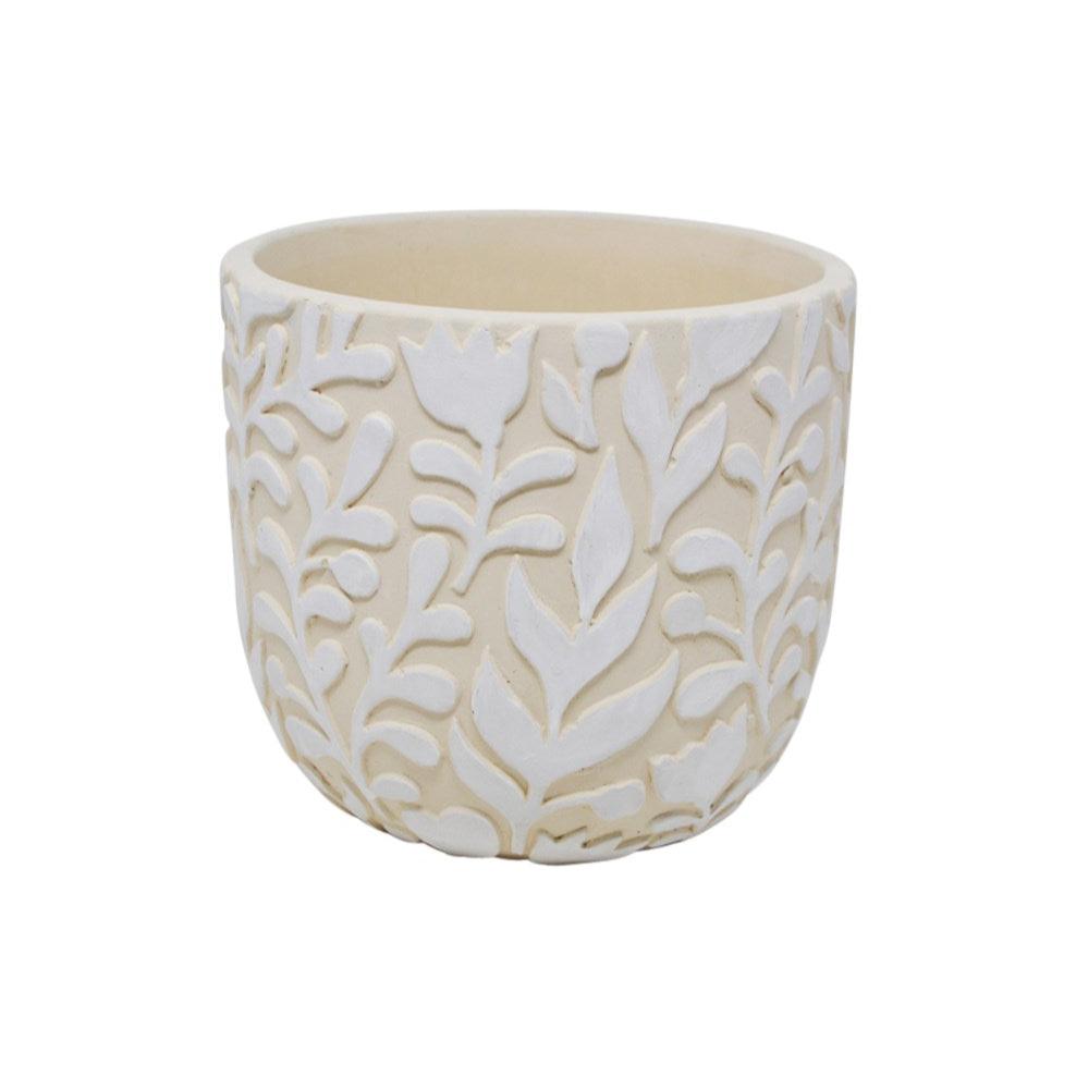 This stylish cement pot is perfect for adding life to any living space. It features an etched floral design in a white and beige palette, bringing a touch of elegance to any corner of your home. Its highly durable cement material ensures it will withstand wear and tear, while its lightweight build allows you to easily move it around and place it where desired.