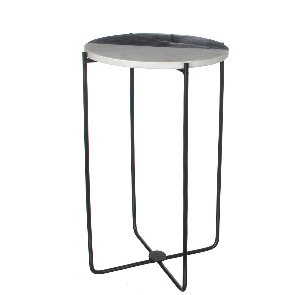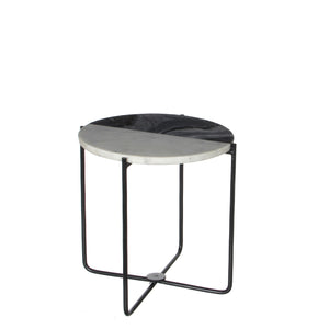 A small table perfect for beside a lounge chair or to be used as a plant stand. Features a two tone marble top, split evenly between light and dark. Featuring sleek black metal legs.