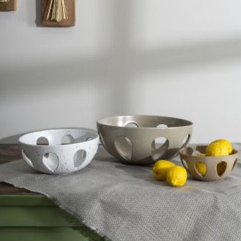 Help keep your produce fresh or show off beautiful objects in the open-weave Orchard Bowl in ceramic. A speckled glazed finish in neutral tones and tear-drop openings combine for an elegant bowl for your kitchen or decor. Available in two sizes, small and medium.
