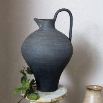 Dramatic curves and a statement handle draw all attention to the Ravine Jug. This handmade terracotta pitcher evokes a sense of ancient beauty and modern simplicity.