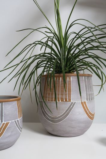 The Restoration Pot is a calming combination of natural terracotta that is hand-painted grey, and detailed with a white line pattern.
