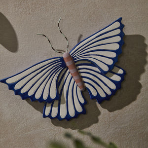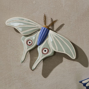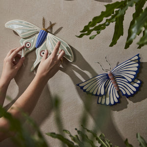 Bring artful reminders of nature to the walls with the large-scale Sculpted Moth Wall Art. This stunning Spotted Moth ceramic piece hangs with 2 keyhole openings in back. With a painted metal antenna & intricate hand painted detailing on the wings & body, this art piece coordinates beautifully with the other luna & striped moths for a playful yet elevated design on a gallery wall.