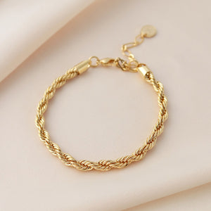 A twisted gold-plated dream, Sloane is a bracelet with a lobster claw closure that makes a bold statement. Sloane is also available as a necklace.