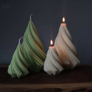 Introducing the swirl Christmas Tree Candle, each tree is individually handmade with natural soy wax. Our Swirl tree candle can be styled on your dining table, coffee table, or on your mantel (to name a few).