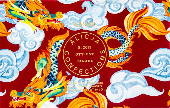 Wasabi is a 54.5% dark chocolate bar. This bar has serious spice. A true Japanese flavour. If you like nose clearing spicy, you'll love this bar. We challenge you to eat more than 4 squares at once!